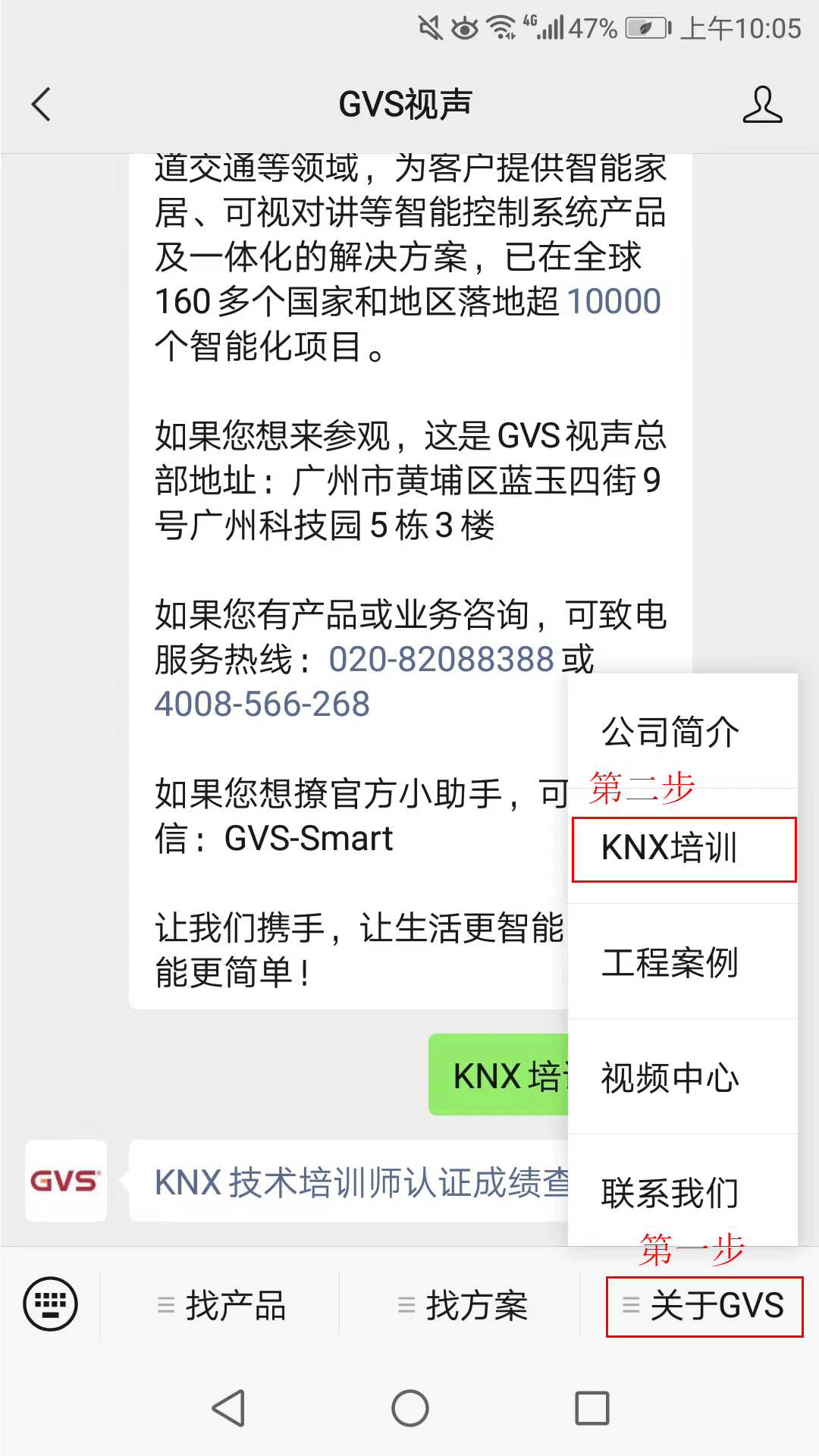 打開公眾號(hào)“GVS視聲”會(huì)話窗口,點(diǎn)擊自定義菜單“關(guān)于GVS”,進(jìn)入“KNX培訓(xùn)”,下滑頁面輸入姓名/KNX賬號(hào)或證書編號(hào)查詢。