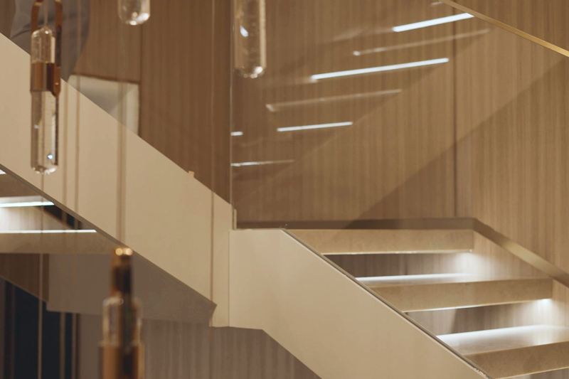 跟隨生活場(chǎng)景隨心調(diào)配燈光,中餐模式、西餐模式、會(huì)客模式、品茗模式......即使是同一個(gè)空間,也能營造出不同的氛圍感貫徹一層負(fù)一層空間的踏步燈帶旋轉(zhuǎn)梯,燈隨人亮,靈動(dòng)智能,上下樓都有了別樣的趣味